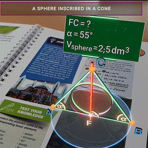Each page of the 40-topic publication features a special image, which triggers the corresponding AR video on the screen when scanned with a mobile device camera. 3D holograms are used to show the spatial and plane geometry. These multimedia contents explain geometric concepts and theorems through narration in addition to the visual presentation.